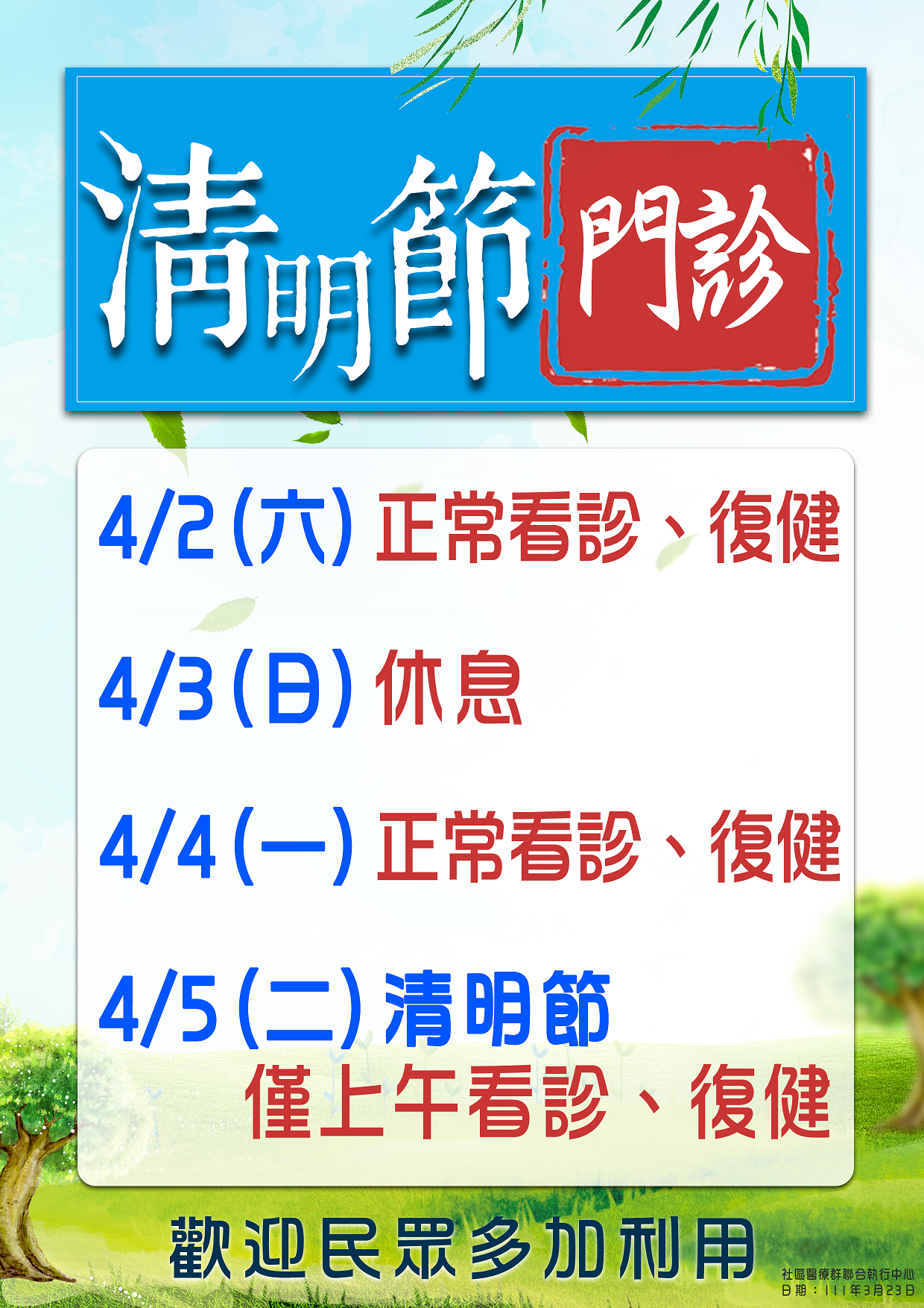 | 清明連假門診時間公告